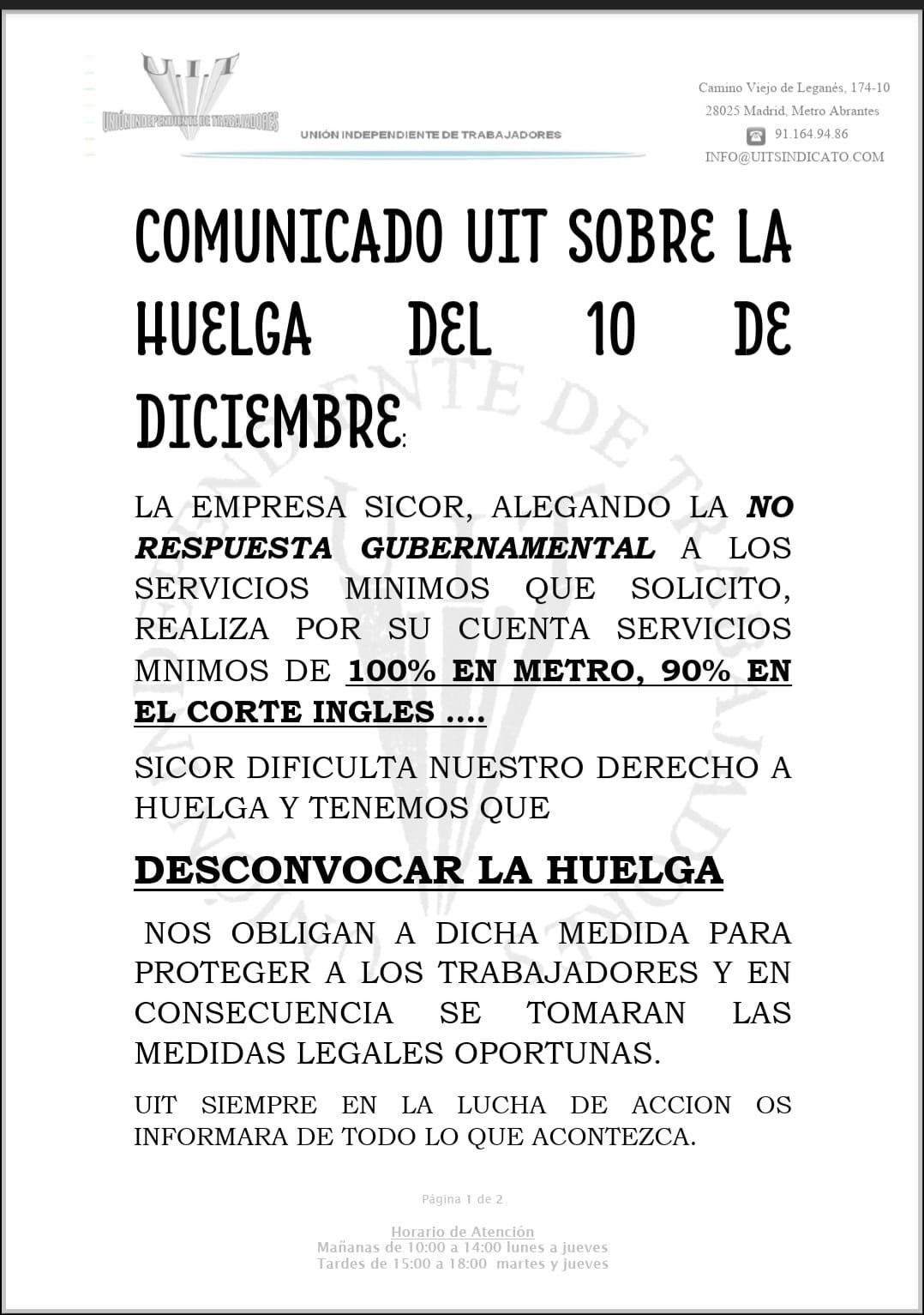 La huelga se ha suspendido ya que Sicor sin esperar la resolución de mínimos de la delegación de gobierno y sin querer negociarlos con el comite de huelga, impone unos mínimos del 100% en Metro de Madrid y un 90% en Los Corte Ingles no siendo estos infraestructuritas criticas y por lo tanto no están sujetos a mínimos, por le bien de los compañeros y por no poder ejercerla , procedemos a la desconvocatoria y procederemos a las denuncias de vulneración de derechos fundamentales. UIT SIEMPRE EN LA LUCHA