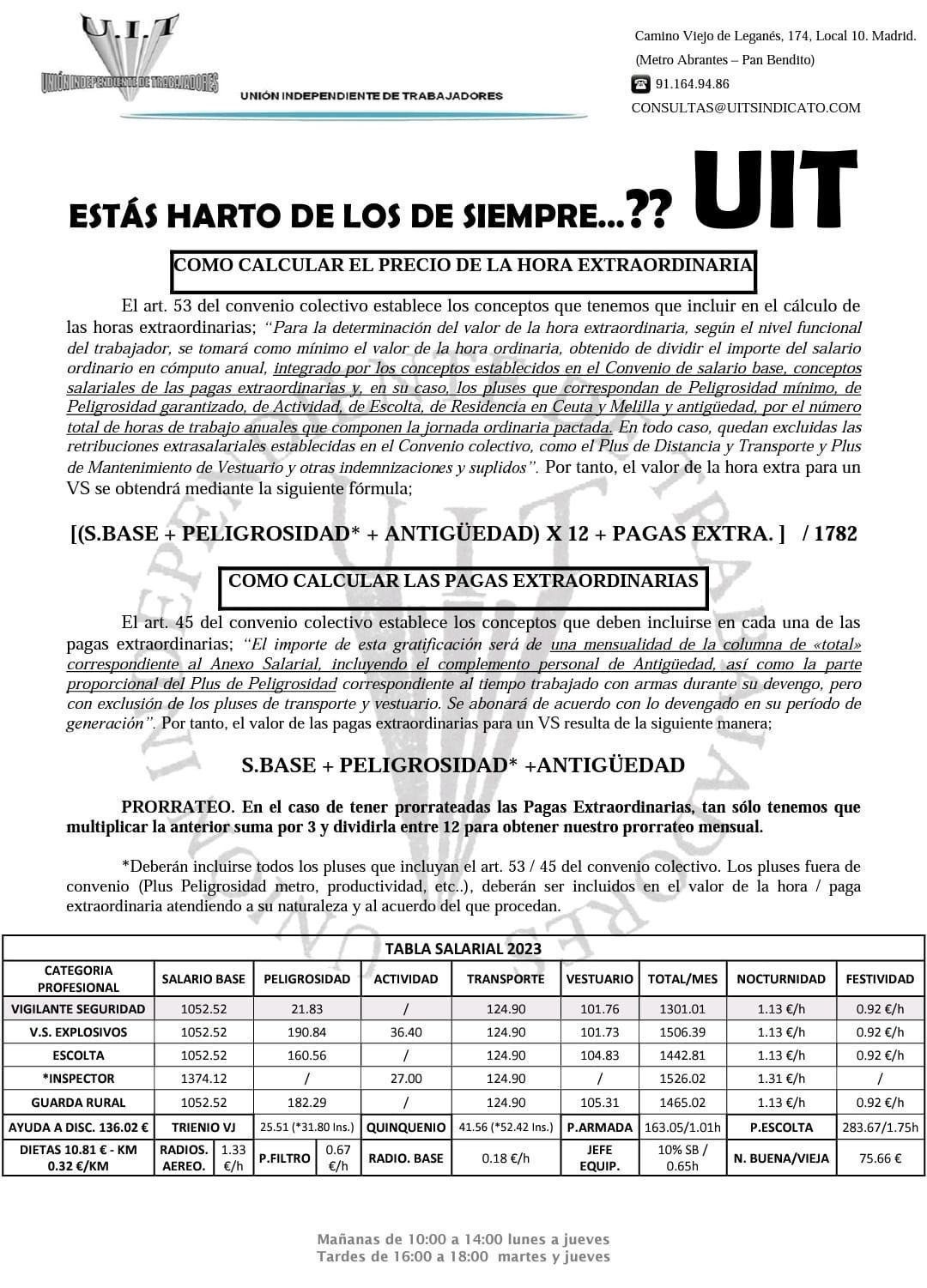 COMUNICADO: UIT, SECCION SINDICAL ALERTA Y CONTROL, MADRID. Buenas compañeros de Alerta y Control, el día 10.12.2022 se cumple un año que se constituyó el comité de Alerta y Control. Yo, Sebastián Ruiz Álvarez os represento como miembro del comité y quiero haceros un resumen de lo que hemos venido haciendo en el transcurso de todo este año. En primer lugar llevamos unas 17 reuniones Ordinarias y 3 Extraordinarias más 2 reuniones, para negociar las propuestas de la empresa en cuanto cuadrantes anuales y rotación de vacaciones, ya hemos estado 2 veces en inspección de trabajo, con denuncias interpuestas a la empresa por incumplimiento de varias peticiones. 1- Denuncia por no entregarnos balance anual. 2- Denuncia por no entregar la uniformidad de verano en varios servicios. 3- Denuncia del servicio de Getafe por tener al personal de seguridad con temperaturas de extremo calor sin posibilidad de recuperación térmica. 4- Denuncia por mal funcionamiento del portal del empleado. 5- Denuncia por pago tardío del salario, etc. 6- También se ha puesto una denuncia a la empresa por la situación de dos compañeros del servicio Severo Ochoa. Se han visitado varios servicios para preguntar por sus problemas (Hospital infanta Leonor, Ambulatorio Aguacate, Universidad de Alcorcón, etc.) Hace unas semanas tuvimos que asistir al Instituto Laboral. ¿Qué hemos conseguido con todo esto?, pues que la empresa mejore el portal del empleado, que ahora esté colgada la nómina desde el día 1. Se pidió también a la empresa en una de las reuniones que la nómina se mandara por correo electrónico y al parecer quieren ponerlo en marcha, puesto que a las nuevas incorporaciones les está haciendo firmar una autorización de consentimiento para hacerlo. Se ha conseguido que no vuelva a pagar después de la fecha estipulada por Convenio, se ha conseguido que las 100 horas de formación que nos pertenecen del periodo 2012 a 2016 se os pague a quién lo solicite y justifique. Estamos negociando las de 2017 a 2022 por lo que se fue al Instituto Laboral, no cerrando acuerdo con la empresa. También es cierto que queda mucho por hacer. Otra de las cosas es que ya por fin tenemos local sindical en la nueva sede de la Calle Haya 7 y nuestra sección sindical UIT tiene su hueco para atender vuestros problemas diarios. Ya os notificaré los días y el horario en que estaremos allí para vosotros. En cuanto al curso de reciclaje este año se consiguió que se hiciera a primeros de año, cuando siempre se retrasaba a final de año . Por parte de esta sección sindical se le pidió a la empresa que el curso de reciclaje se pague como un plus y no como se paga ahora, como horas trabajadas. Sabemos que es lo que dice el convenio pero pagándose como horas trabajadas aprovechan para que algunos compañeros que no llegan a cómputo, recuperen horas, y pagadas como plus no se podría hacer. Seguiremos luchando porque se pague como plus porque lo consideramos más justo para todos. A partir de Enero os iré poniendo al día con comunicados mes a mes. Sabéis que a parte de mi, disponéis de dos delegados sindicales que se intercambiarán cada 4 meses a partir del 2023. Por último, hemos pedido a la empresa chalecos o polos anticorte, respondiendo que hagamos un informe de riesgos de los servicios, que durante el 2023 nuestros delegados presentarán a los delegados de prevención para exponerlo. Os pido que cuando seáis agredidos, presentéis a esta sección vuestro parte de lesiones o si hubiese baja por ese motivo, para ir completando el informe. SEGUIREMOS AL PIE DEL CAÑON UIT SIEMPRE EN LA LUCHA